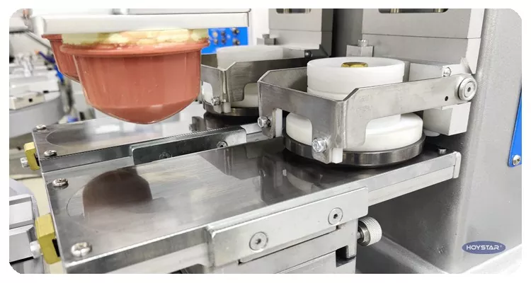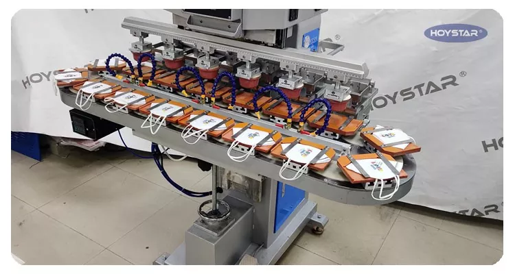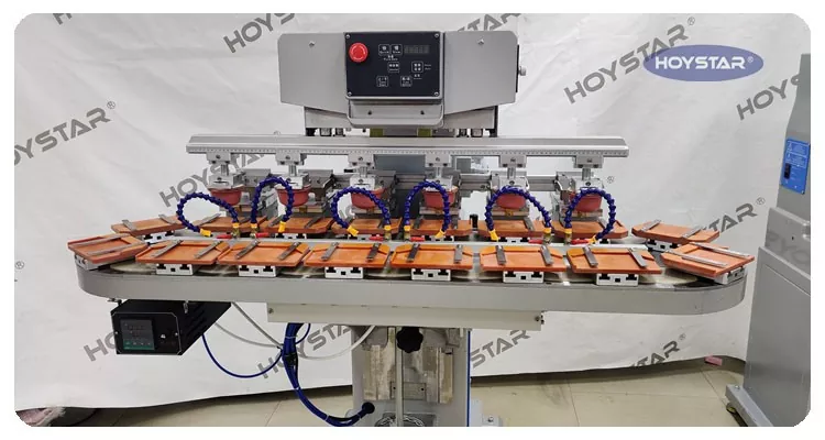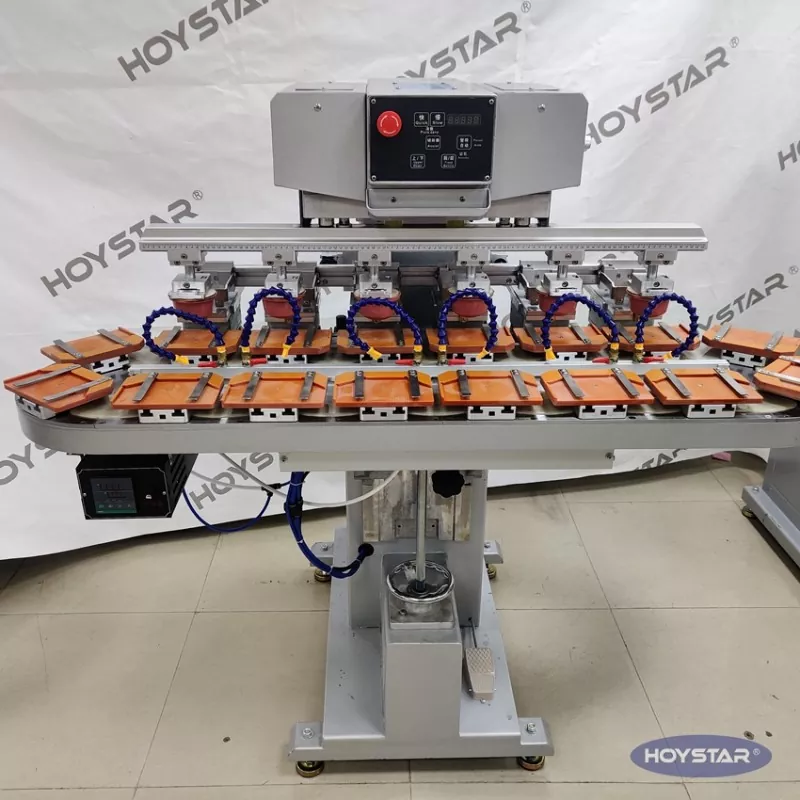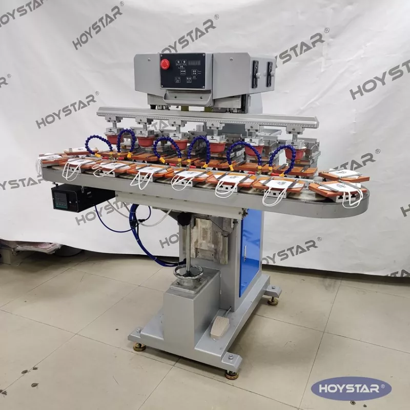 In qualità di produttore professionale in Cina, vorremmo fornirvi una stampante per tamponi a sei colori HOYSTAR ad alta efficienza con piano di lavoro con trasportatore. Questa macchina consente la stampa continua di prodotti a tampone a sei colori, con la registrazione del colore completata in un unico ciclo. Questa macchina adotta un sistema di trasporto a tavola rotante rotante, che consente il trasferimento continuo e regolare del prodotto durante tutto il processo di stampa, capacità di completare la sovrastampa completa a 6 colori in un solo ciclo rotativo. Rispetto alle stampanti tampografiche di tipo shuttle, la sua velocità è molto elevata.
